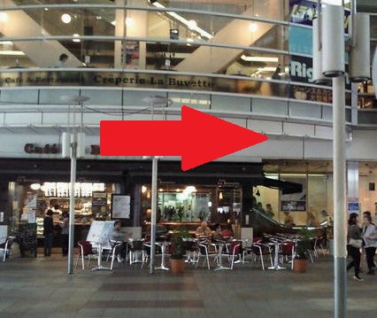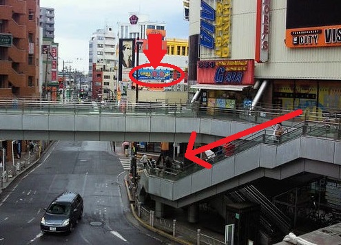パチンコ店脇の階段を降ります。ここで青色の看板が見えます。(写真中央上)